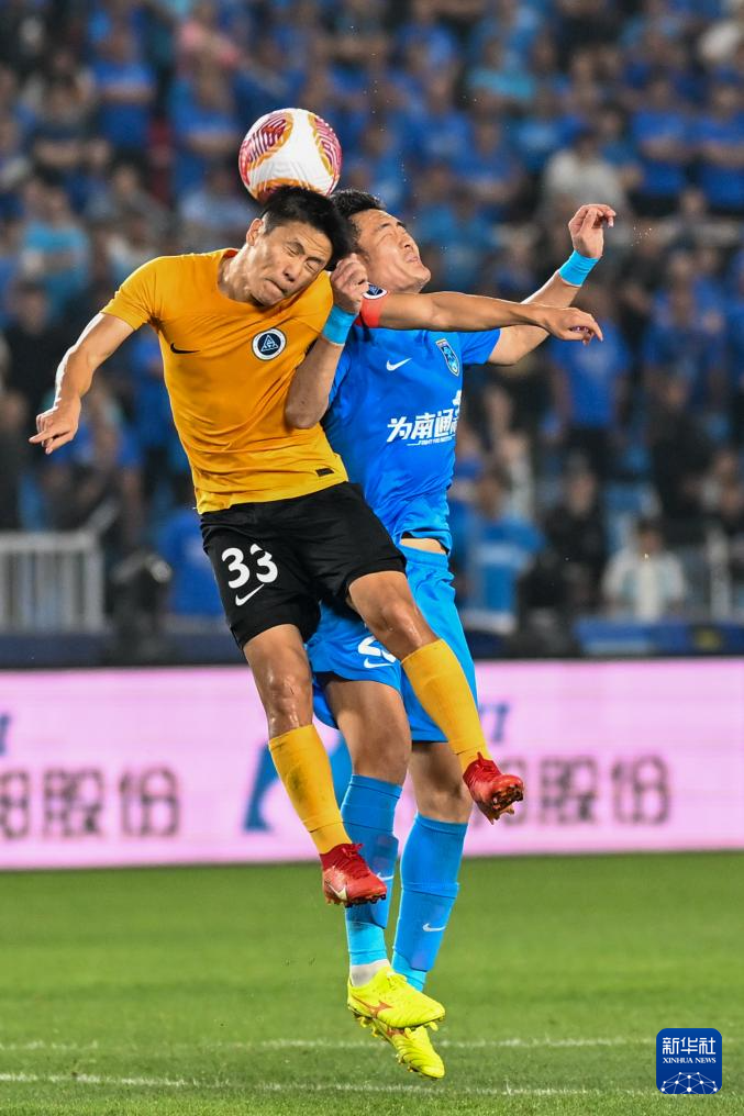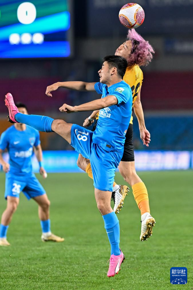 6月14日,深圳新鹏城队球员朱宝杰(左)与南通支云队球员曹康在比赛中争顶。新华社发(王须中摄)