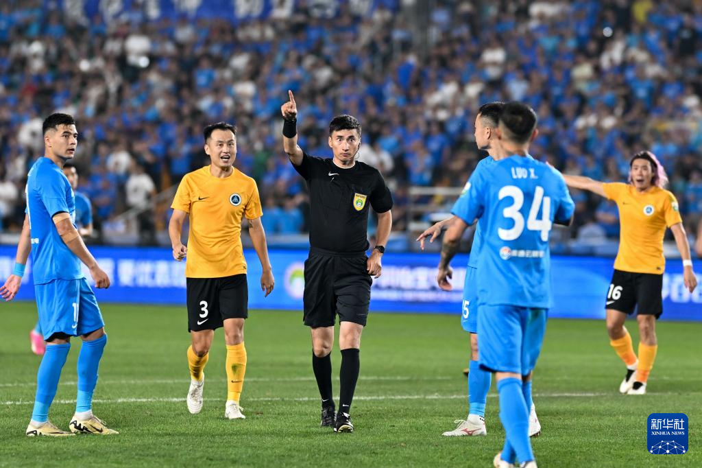 6月14日,主裁判麦麦提江·艾合麦提(中)在比赛中执裁。新华社发(王须中摄)