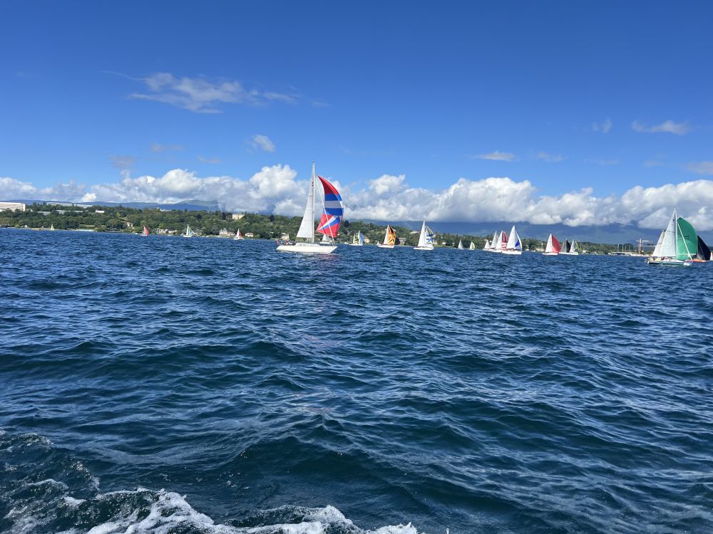 14日夜里的疾风劲雨,让人一度担心15日的比赛能否顺利举行。但当出发的笛声在上午10点响起时,日内瓦已经是碧空如洗,而且风速还有不断增加的趋势,非常适宜帆船比赛。一时间百舸争流,浪花翻滚,几百艘早已游弋在日内瓦湖中的帆船立刻扬帆起航。
