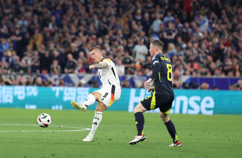 6月14日,德国队球员托尼·克罗斯(左)在比赛中传球。新华社记者 白雪飞 摄