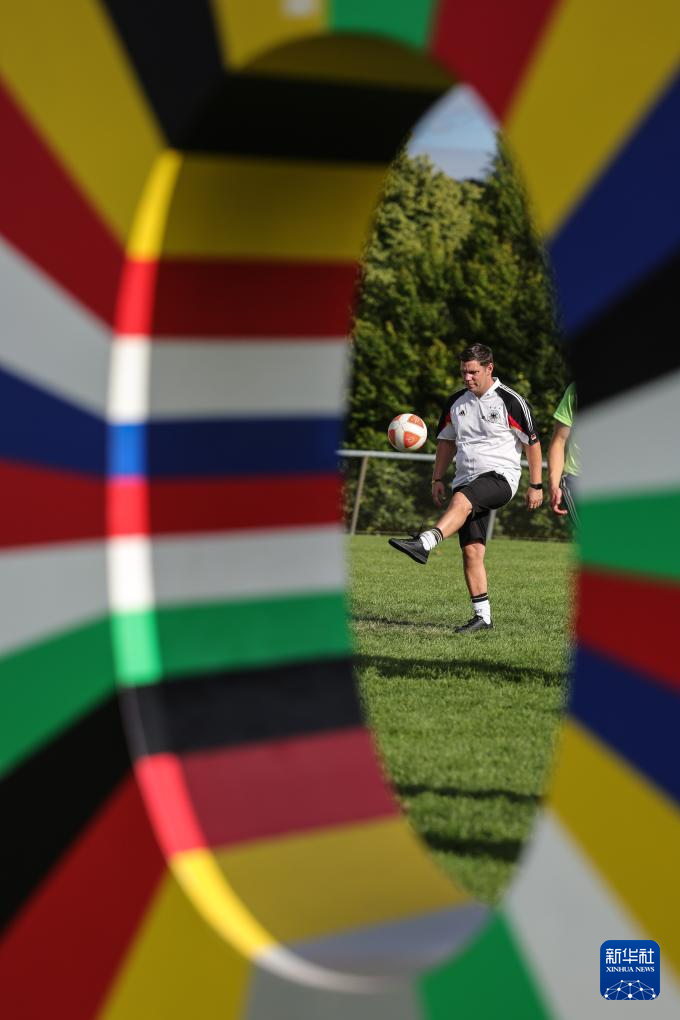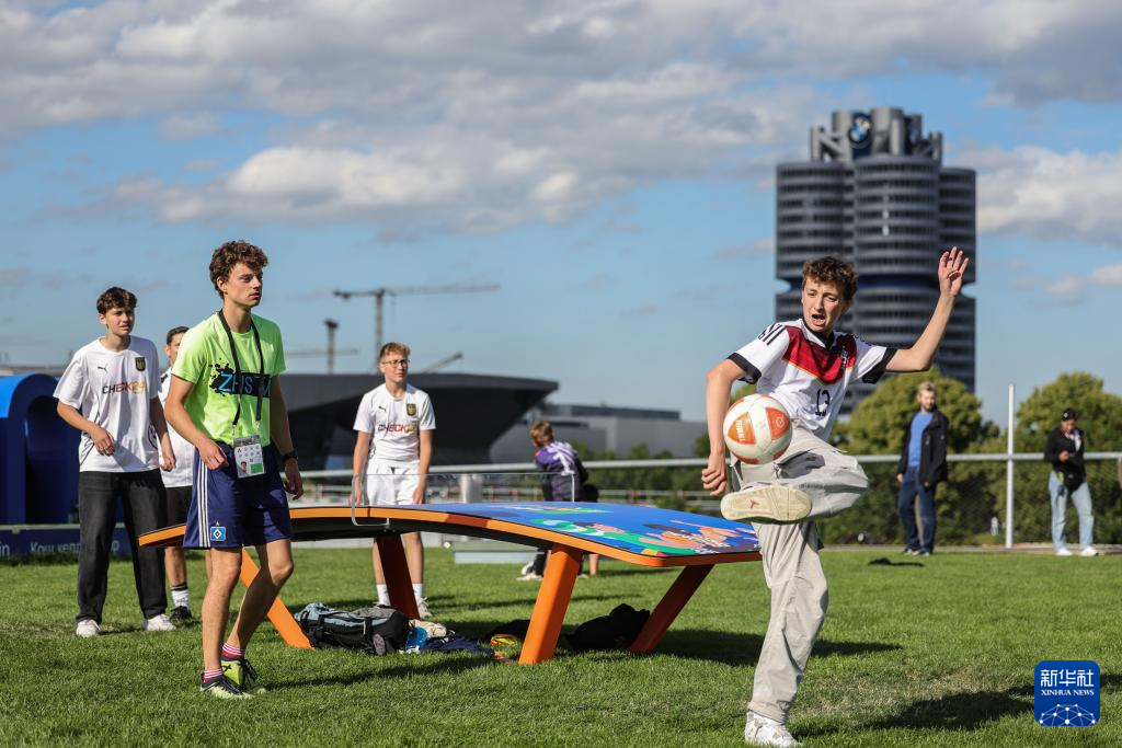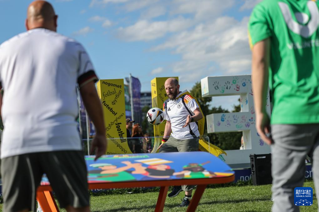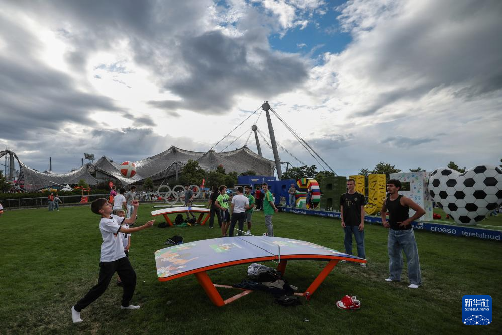 6月14日,球迷在慕尼黑奥林匹克公园球迷广场进行趣味足球活动。新华社记者 潘昱龙 摄