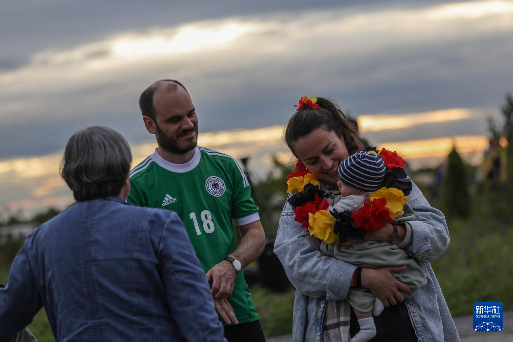 6月14日,德国队球迷在举办揭幕战的安联球场外拍照。新华社记者 张帆 摄