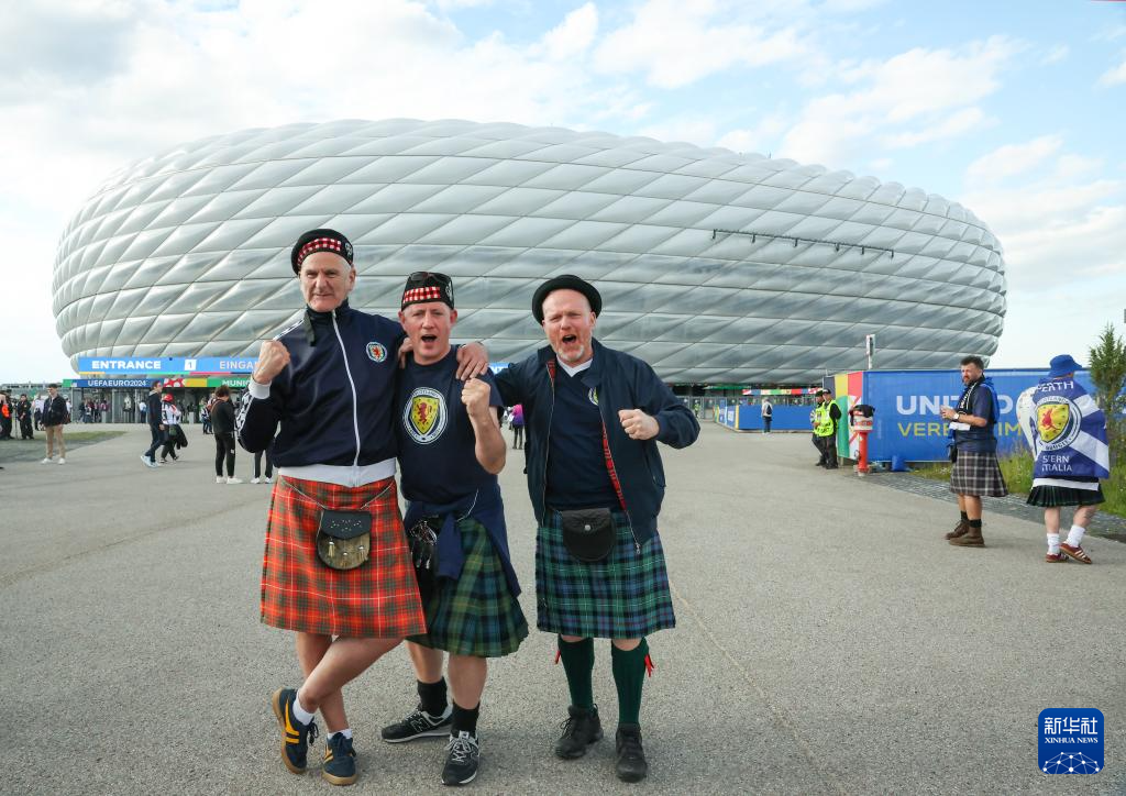 6月14日,苏格兰队球迷在举办揭幕战的安联球场外拍照。新华社记者 张帆 摄