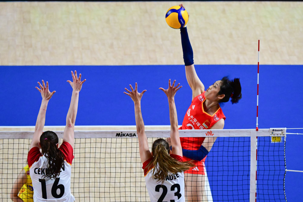 6月14日,中国队球员朱婷(右上)在比赛中扣球。当日,在世界女排联赛中国香港站比赛中,中国队3:0战胜德国队。新华社记者 朱炜 摄