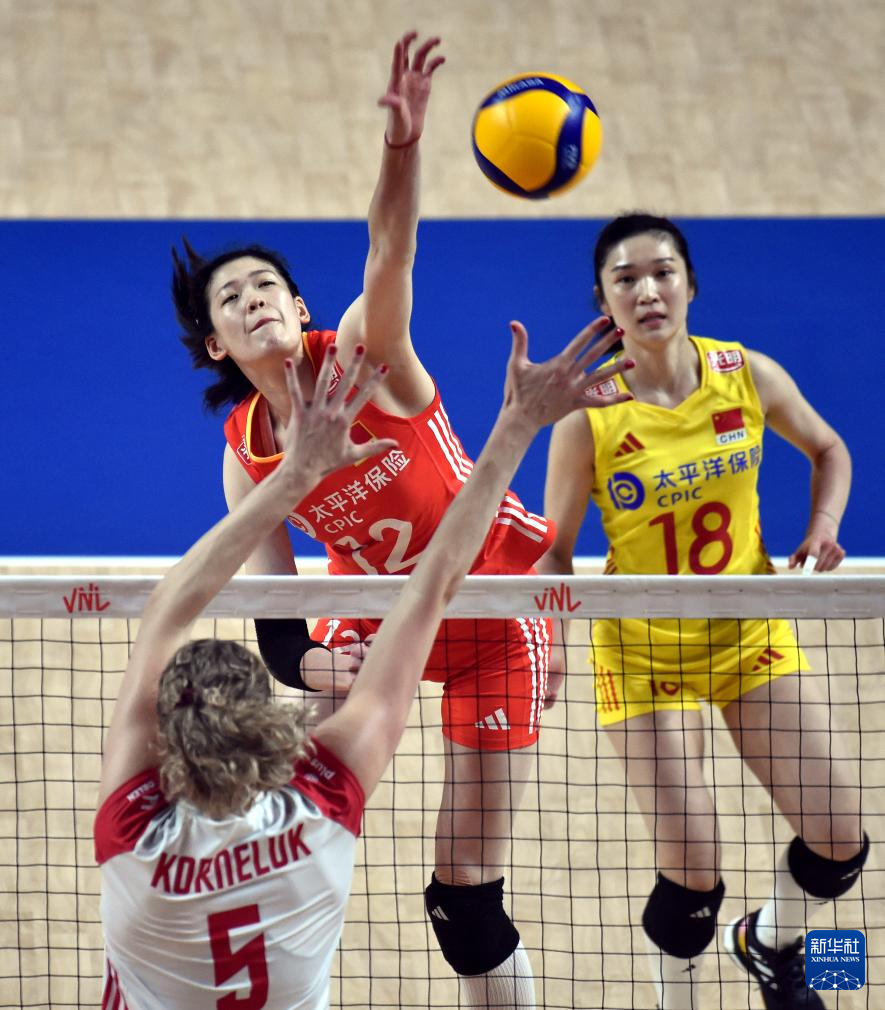 6月16日,中国队球员袁心玥(中)在比赛中吊球。新华社记者 卢炳辉 摄