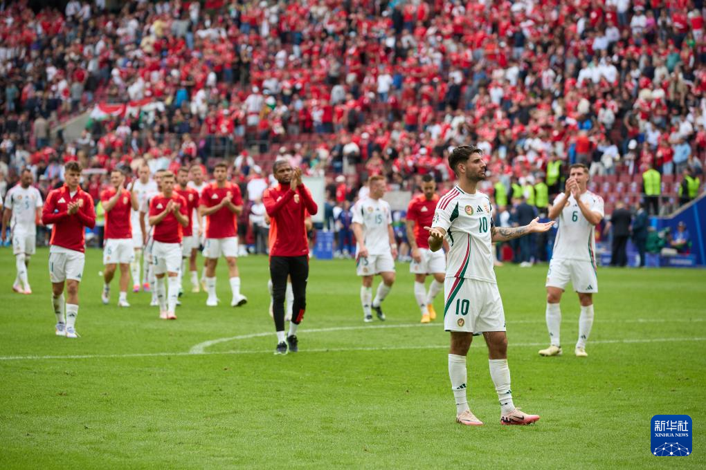 6月15日,匈牙利队球员索博斯洛伊(前)和队友在比赛后。新华社记者 孟鼎博 摄