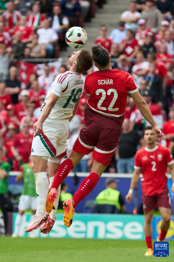 6月15日,匈牙利队球员沃尔高(左)和瑞士队球员舍尔在比赛中争顶。新华社记者 孟鼎博 摄