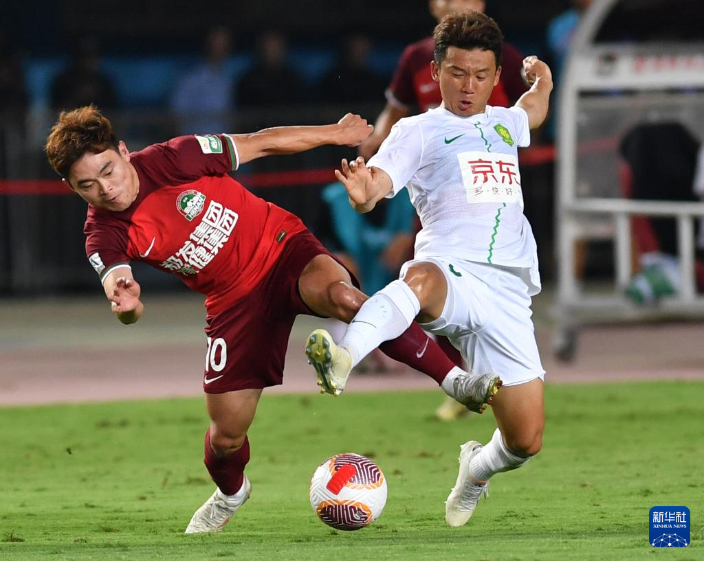 6月15日,河南俱乐部酒祖杜康队球员黄紫昌(左)与北京国安队球员池忠国在比赛中拼抢。新华社记者 李嘉南 摄