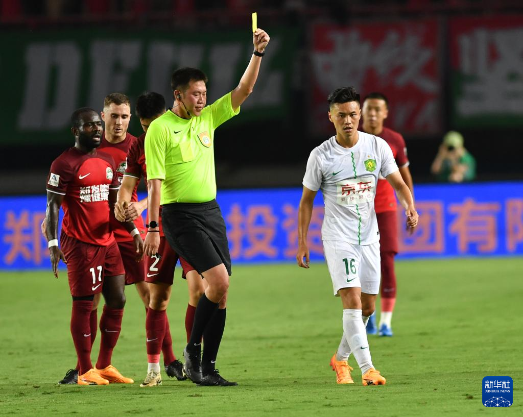 6月15日,主裁判甘树然(前左)在比赛中向北京国安队球员冯博轩(前右)出示黄牌。新华社记者 李嘉南 摄