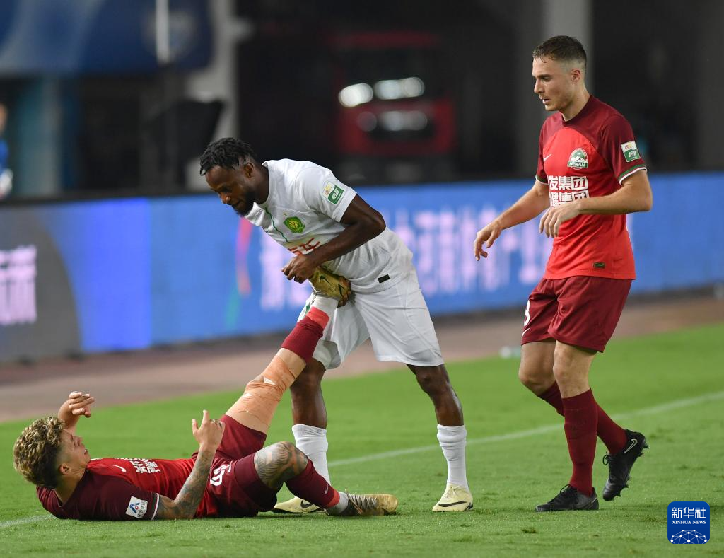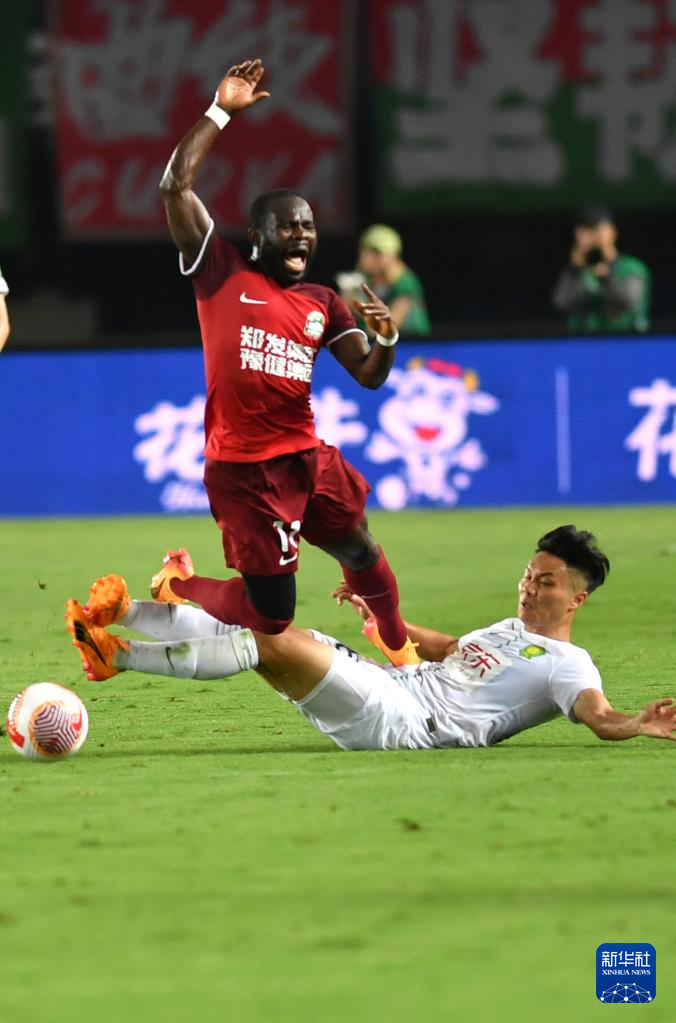 6月15日,河南俱乐部酒祖杜康队球员阿奇姆彭(上)在比赛中被北京国安队球员冯博轩侵犯。新华社记者 李嘉南 摄