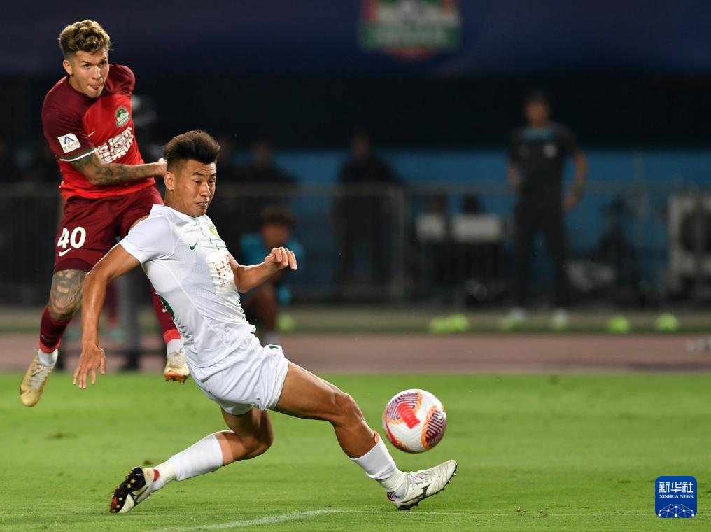 6月15日,河南俱乐部酒祖杜康队球员纳萨里奥(后)在比赛中射门得分。新华社记者 李嘉南 摄
