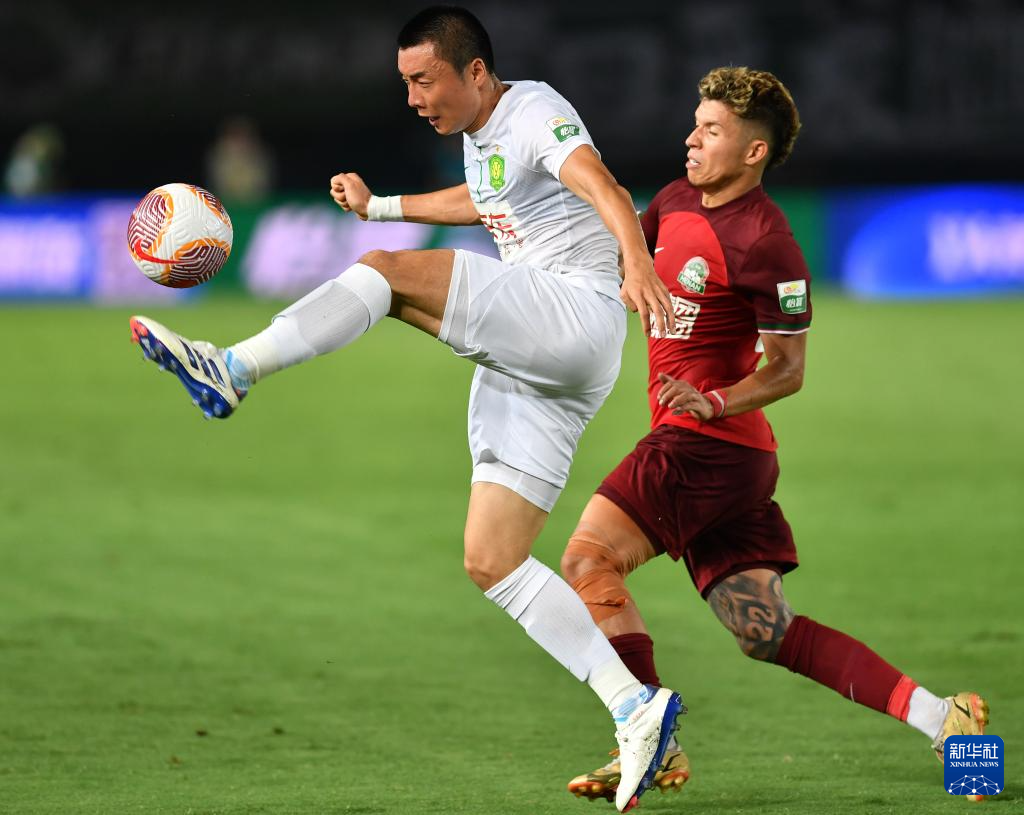 6月15日,北京国安队球员李磊(左)与河南俱乐部酒祖杜队球员纳萨里奥在比赛中拼抢。新华社记者 李嘉南 摄
