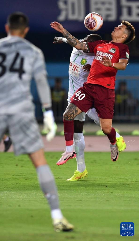 6月15日,河南俱乐部酒祖杜康队球员尼曼贾·科维奇(左)在比赛中头球破门得分。新华社记者 李嘉南 摄