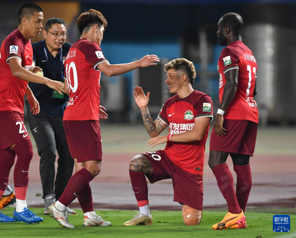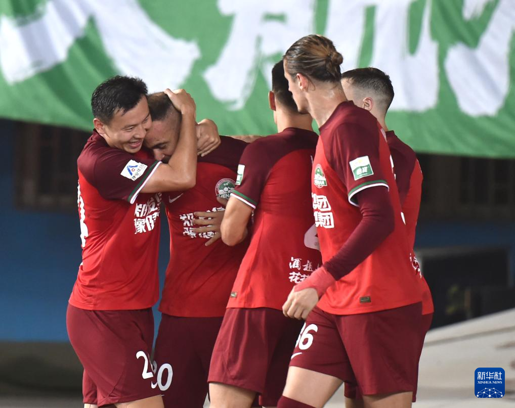 6月15日,河南俱乐部酒祖杜康队球员在比赛中庆祝进球。新华社记者 李嘉南 摄