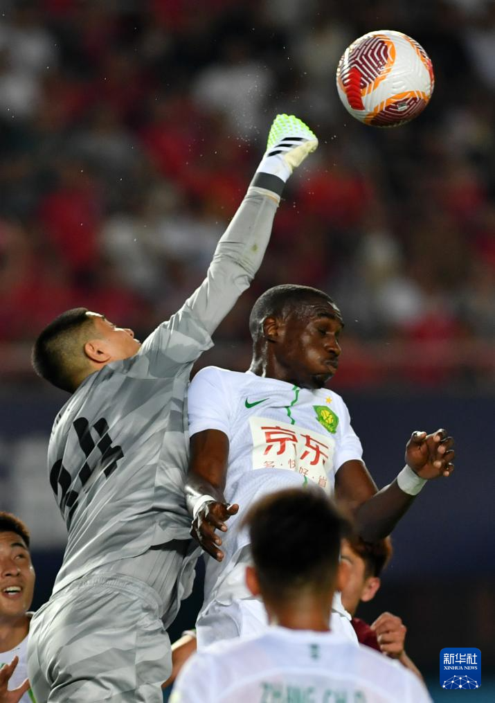 6月15日,北京国安队门将侯森(左)在比赛中将球击出。新华社记者 李嘉南 摄