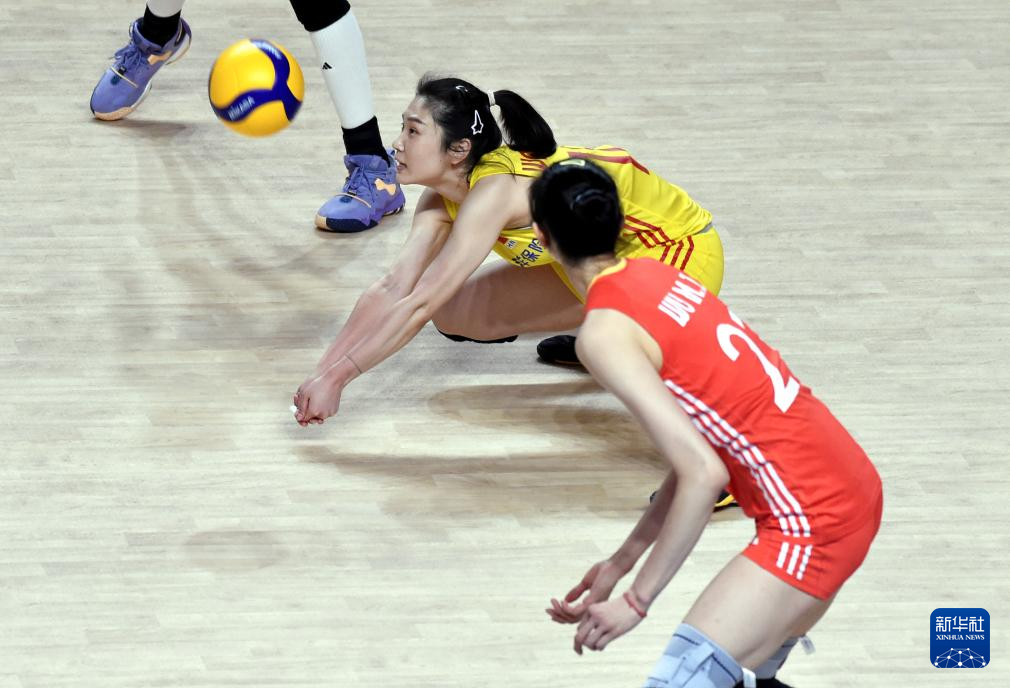 6月16日,中国队球员王梦洁(上)在比赛中垫球。新华社记者 卢炳辉 摄
