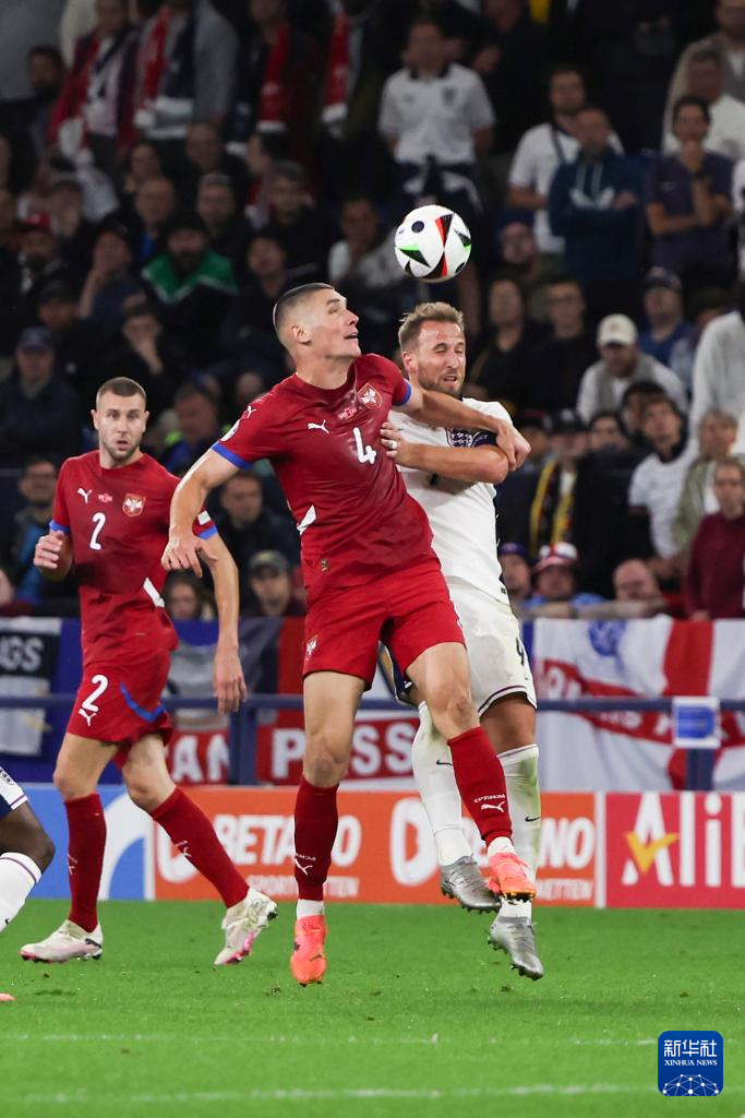 6月16日,塞尔维亚队球员尼古拉·米伦科维奇(前左)和英格兰队球员哈里·凯恩在比赛中争抢头球。新华社记者 张帆 摄