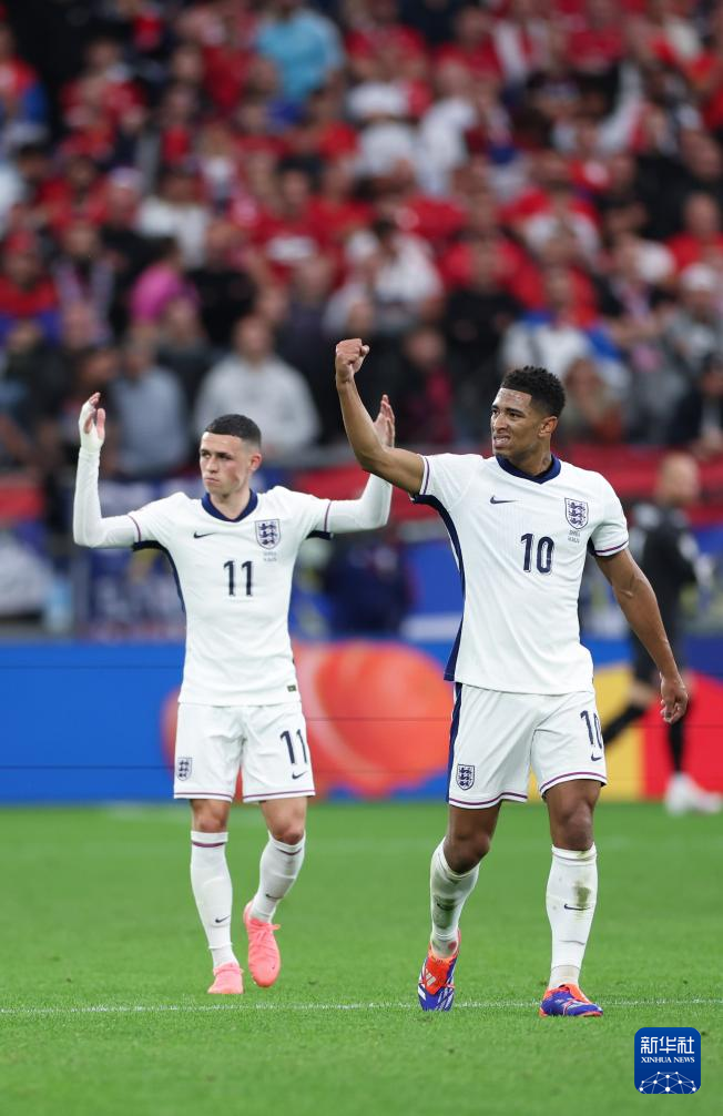 6月16日,英格兰队球员贝林厄姆(右一)在比赛中破门得分。新华社记者 白雪飞 摄