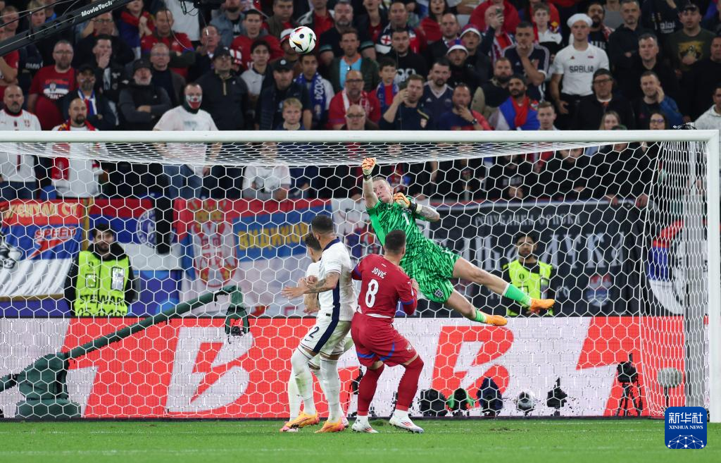 6月16日,英格兰队守门员皮克福德(上)在比赛中扑救。新华社记者 白雪飞 摄