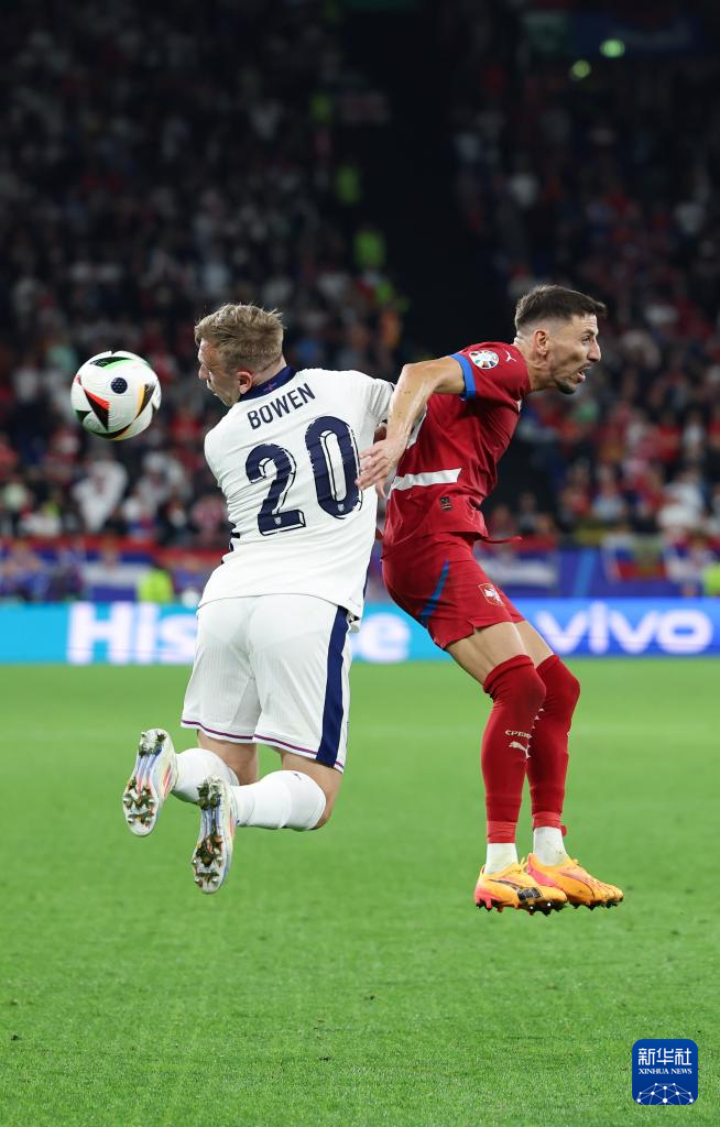 6月16日,英格兰队球员贾罗德·鲍温(左)和塞尔维亚队球员菲利普·姆拉德诺维奇在比赛中拼抢。新华社记者 白雪飞 摄