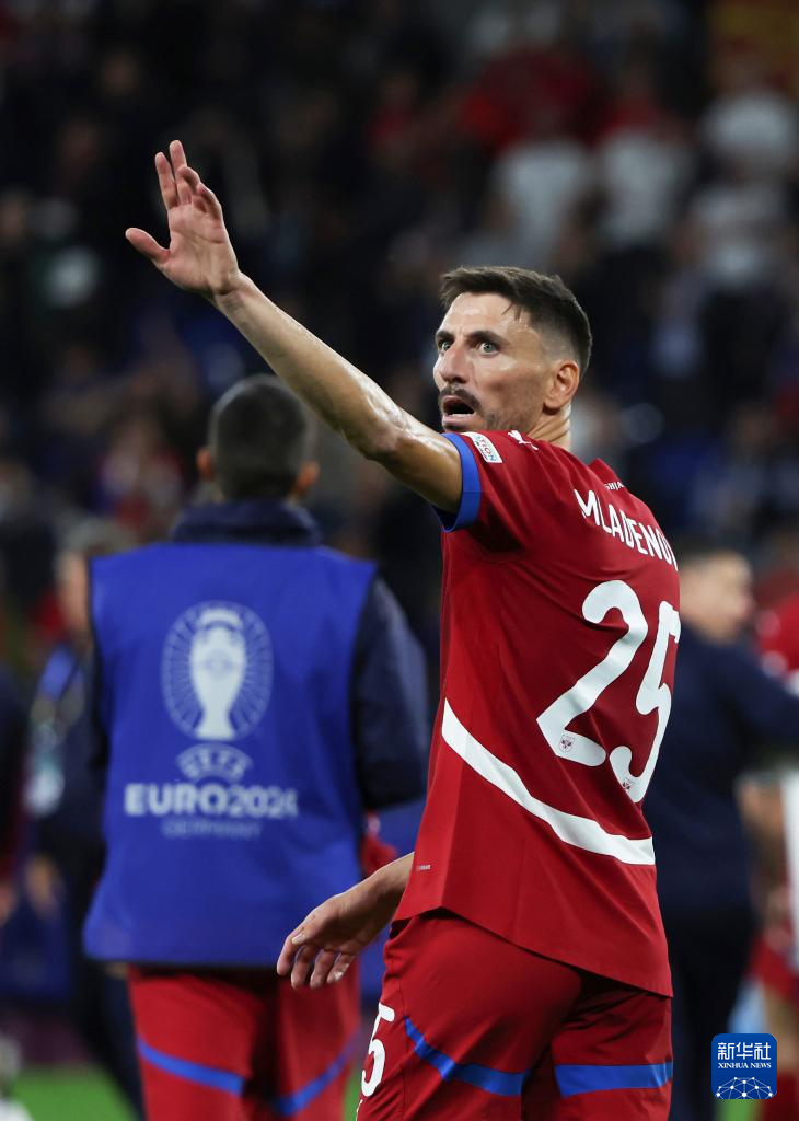 6月16日,塞尔维亚队球员菲利普·姆拉德诺维奇赛后向观众席挥手。新华社记者 张帆 摄