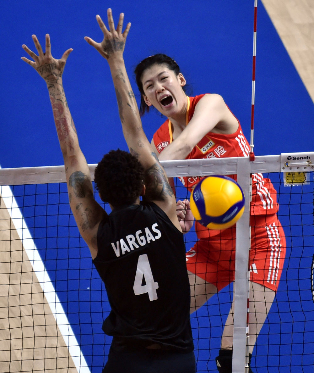 6月15日,中国队球员李盈莹(右)在中国队3:2战胜土耳其队的比赛中扣球。新华社记者 卢炳辉 摄