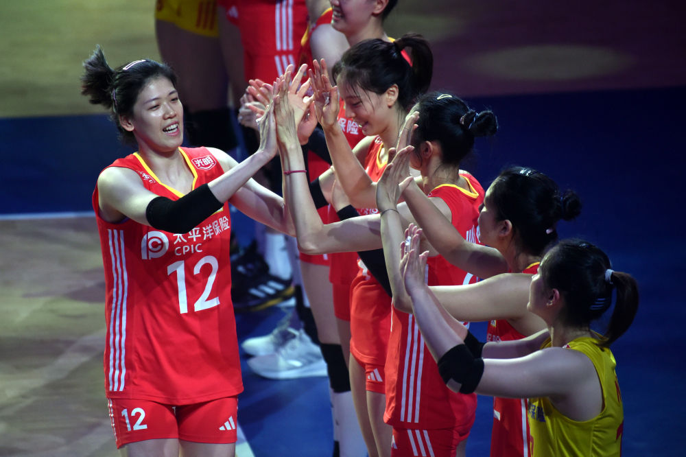 6月16日,中国队球员李盈莹(左)在出场仪式上与队友击掌。新华社记者 卢炳辉 摄