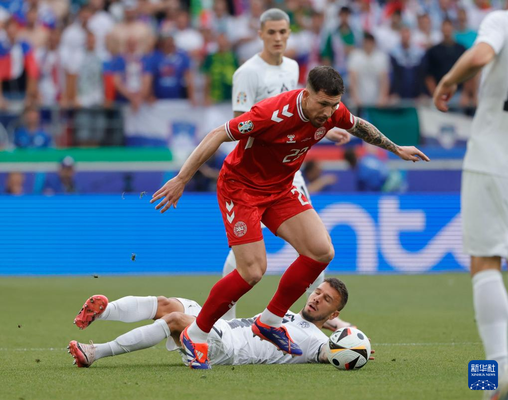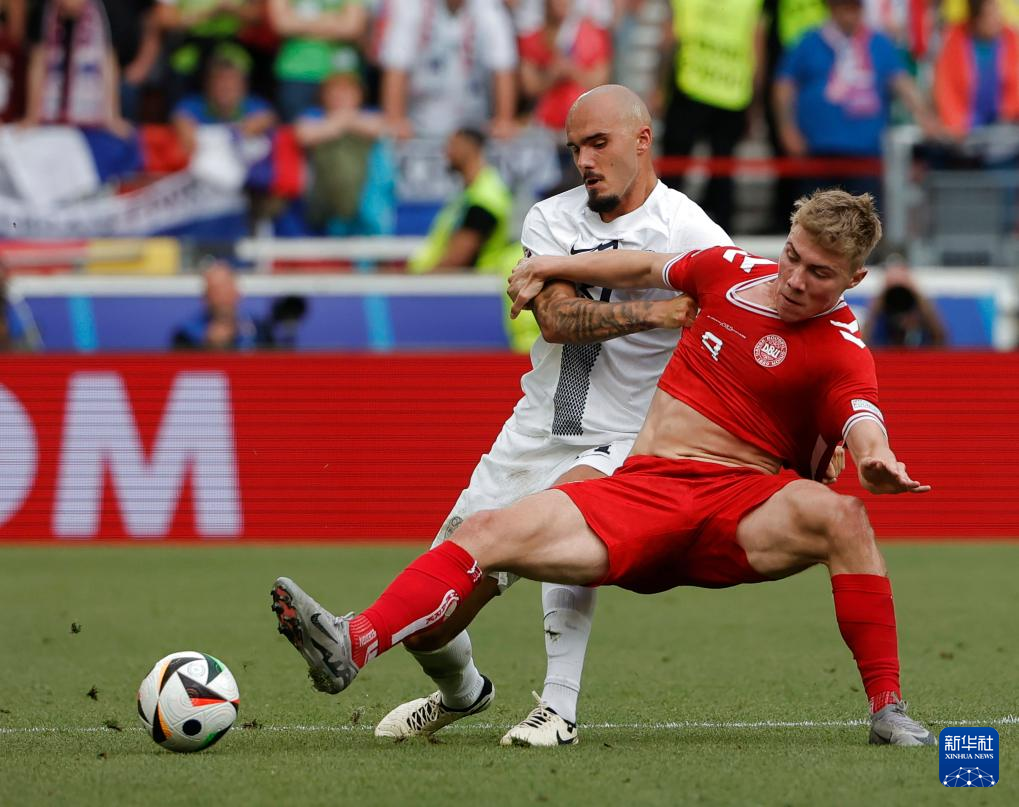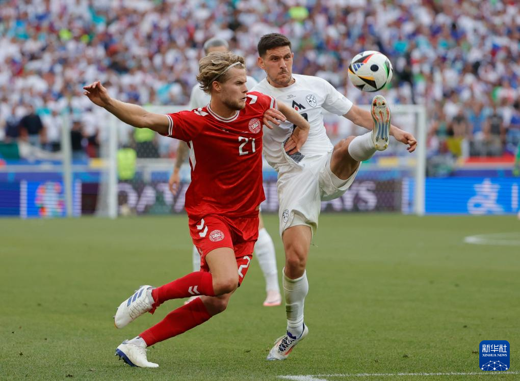 6月16日,斯洛文尼亚队球员德尔库西奇(左)和丹麦队球员拉斯穆斯·霍伊伦德在比赛中拼抢。新华社发(菲利普·鲁伊兹摄)