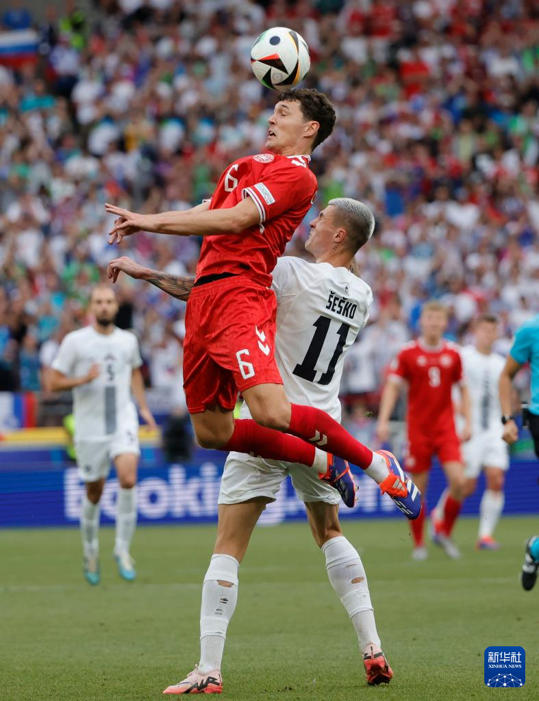 6月16日,丹麦队球员安德烈亚斯·克里斯滕森(上)和斯洛文尼亚队球员本杰明·塞斯科在比赛中争顶头球。新华社发(菲利普·鲁伊兹摄)