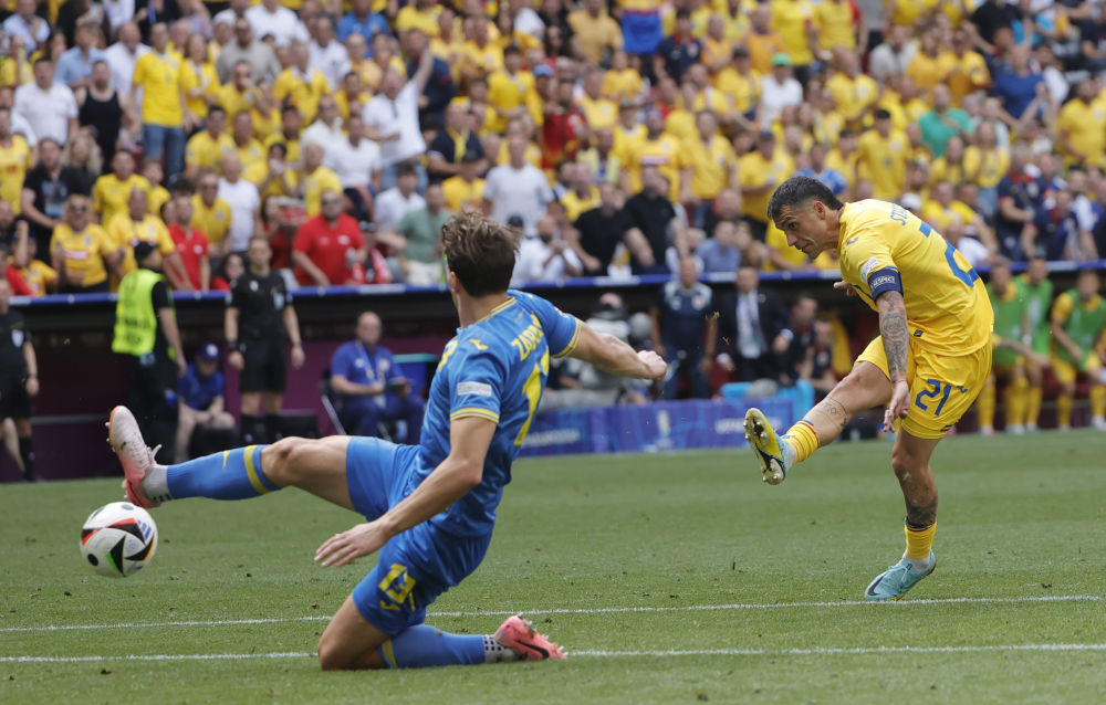 6月17日,罗马尼亚队球员斯坦丘(右)在比赛中射门。新华社发(菲利普·鲁伊兹摄)