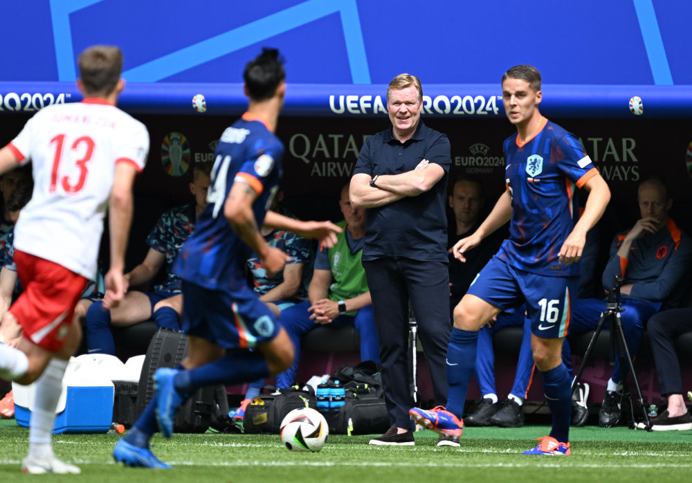 6月16日,荷兰队主教练罗纳德·科曼(右二)场边观战。当日,在德国汉堡进行的2024年欧洲足球锦标赛小组赛D组首轮比赛中,波兰队对阵荷兰队。新华社记者 肖艺九 摄