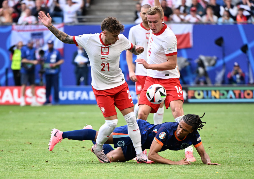 6月16日,波兰队球员扎莱夫斯基(左)与荷兰队球员内森·阿克(下)在比赛中拼抢。当日,在德国汉堡进行的2024年欧洲足球锦标赛小组赛D组首轮比赛中,波兰队对阵荷兰队。新华社记者 肖艺九 摄