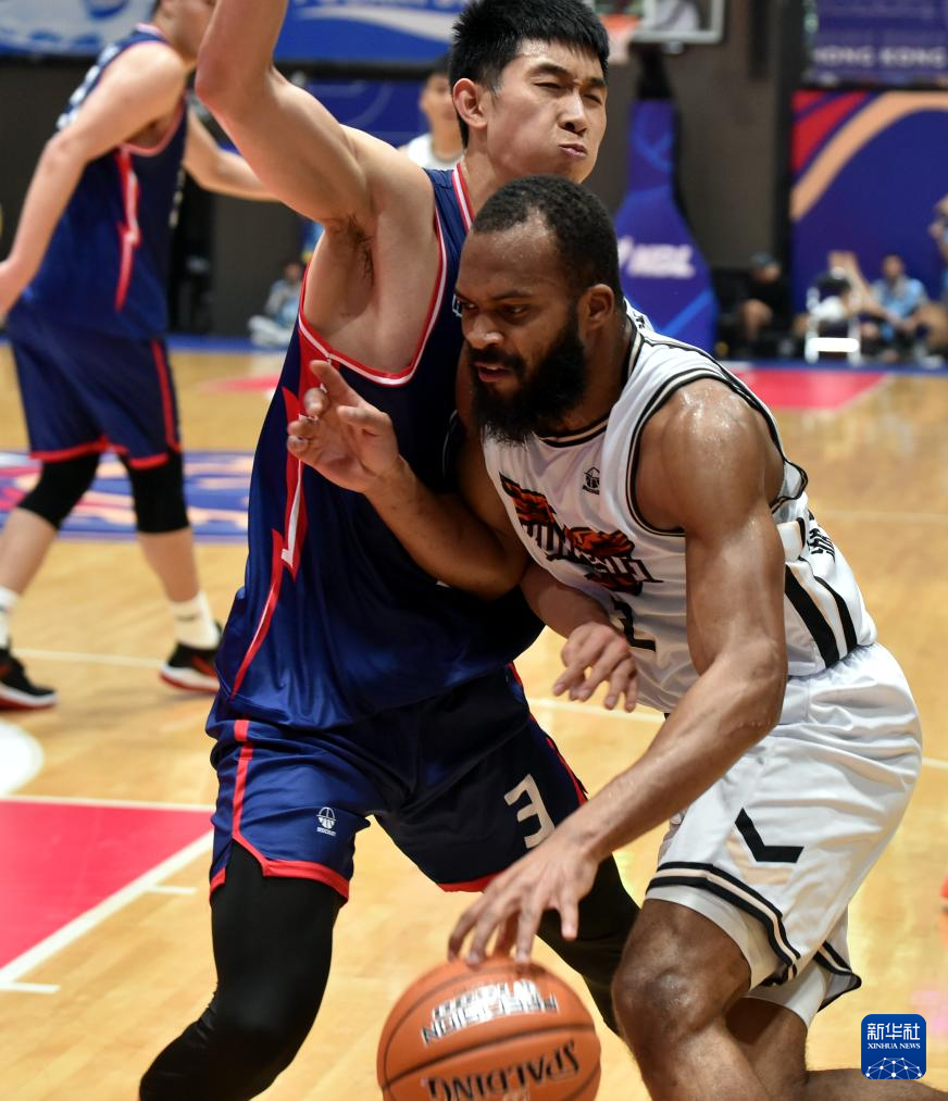 6月21日,香港金牛队球员刁展望(左)防守武汉锟鹏队球员吉恩塔尔·西拉。新华社记者 卢炳辉 摄