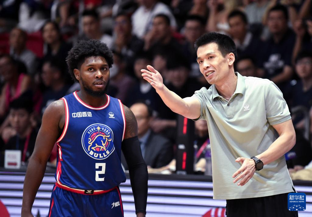 6月21日,香港金牛队主教练解立彬(右)指导球员乔丹·沃克。新华社记者 卢炳辉 摄