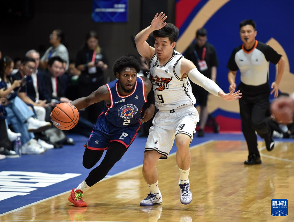 6月21日,香港金牛队球员孙晨然(右)防守武汉锟鹏队球员贾维恩·拉马克斯·哈姆雷特。新华社记者 卢炳辉 摄