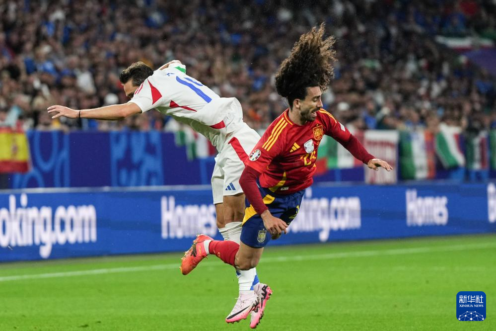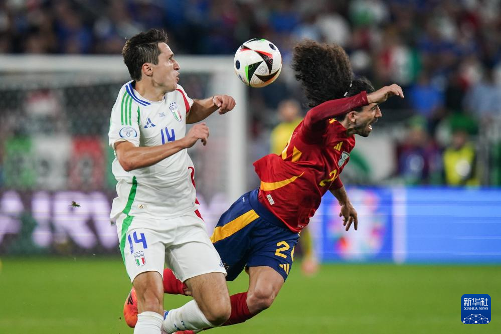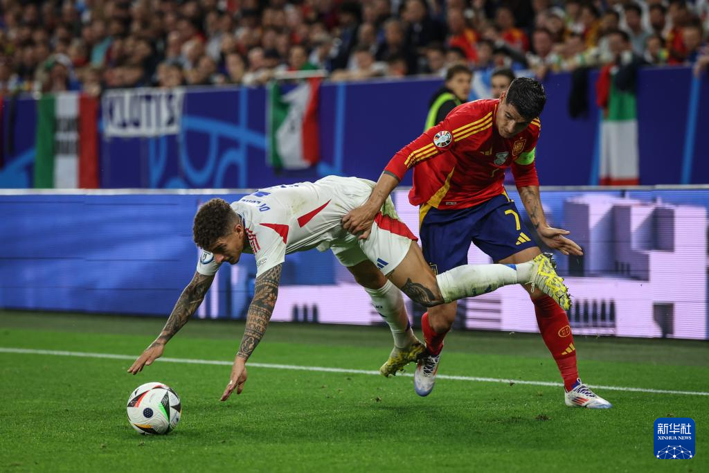 6月20日,意大利队球员迪洛伦佐(左)在比赛中与西班牙队球员莫拉塔拼抢。新华社记者 潘昱龙 摄