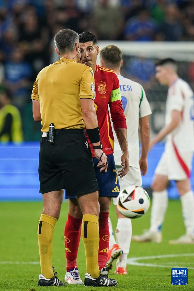 6月20日,西班牙队球员莫拉塔(左二)向主裁判申诉。新华社记者 彭子洋 摄