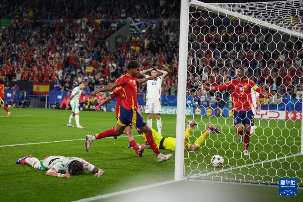 6月20日,西班牙队球员亚马尔(前左二)庆祝对方乌龙球。新华社记者 彭子洋 摄