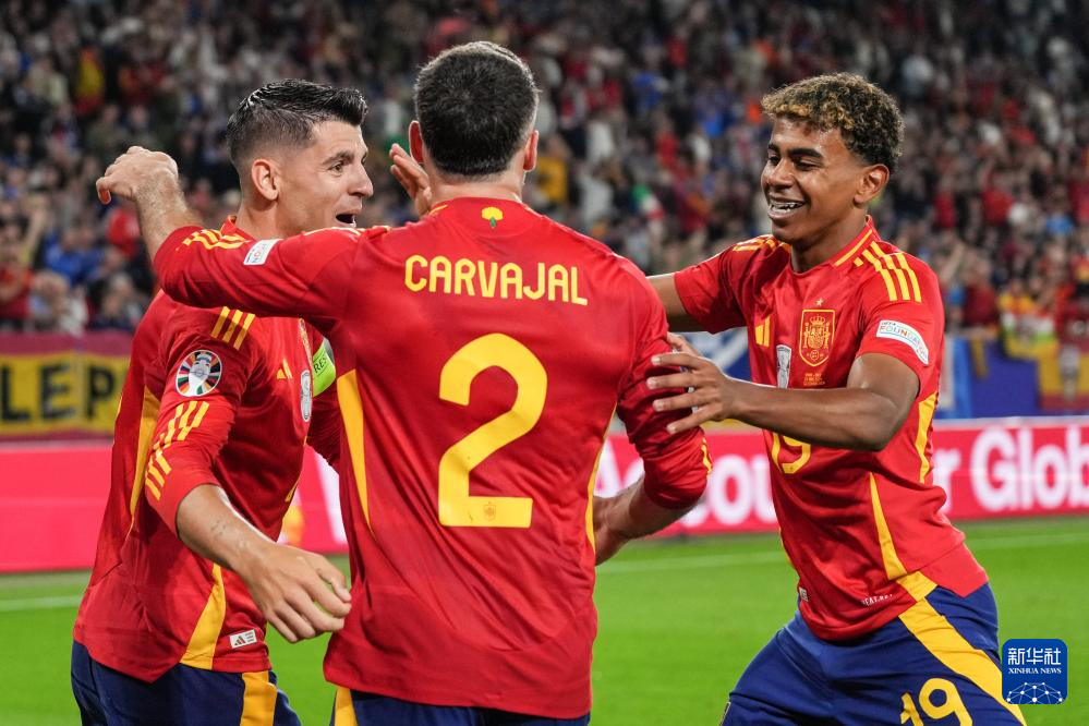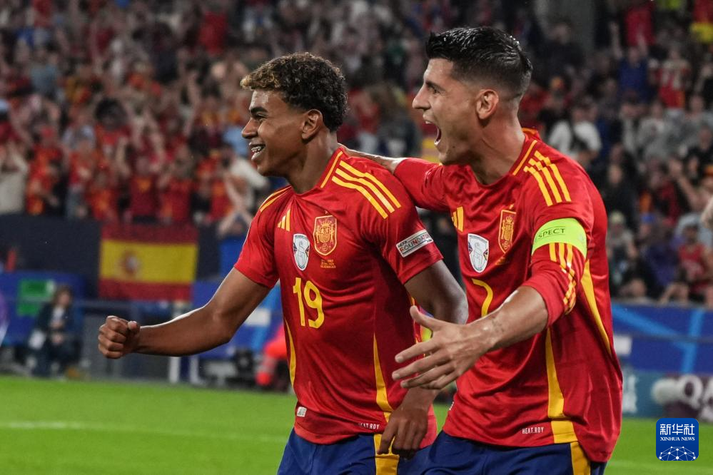 6月20日,西班牙队球员亚马尔(左)与莫拉塔庆祝进球。新华社记者 彭子洋 摄