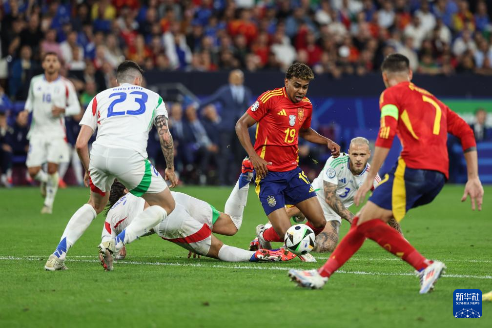 6月20日,西班牙队球员亚马尔(右二)在比赛中带球突破。新华社记者 潘昱龙 摄