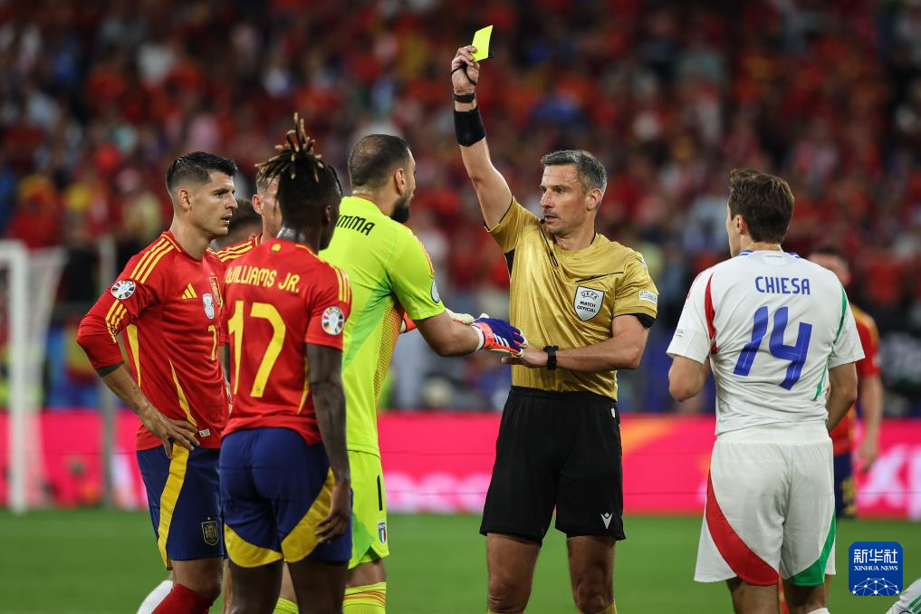 6月20日,主裁判向意大利队守门员唐纳鲁马(右三)出示黄牌。新华社记者 潘昱龙 摄