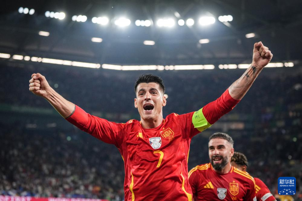 6月20日,西班牙队球员莫拉塔庆祝对方乌龙球。新华社记者 彭子洋 摄