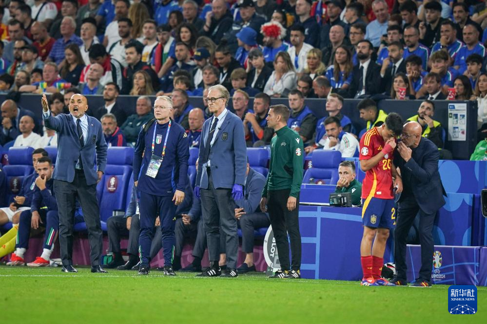6月20日,意大利队主教练斯帕莱蒂(左一)在场边指挥,西班牙队主教练德拉富恩特(前右一)把队员喊回身边面授机宜。新华社记者 彭子洋 摄