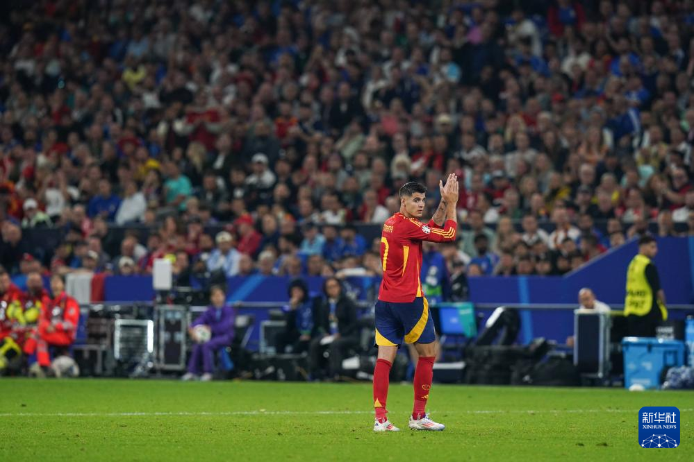 6月20日,西班牙队球员莫拉塔下场前向观众致意。新华社记者 彭子洋 摄