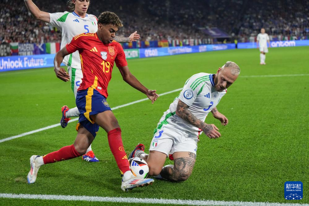 6月20日,西班牙队球员亚马尔(左)带球过人。新华社记者 彭子洋 摄
