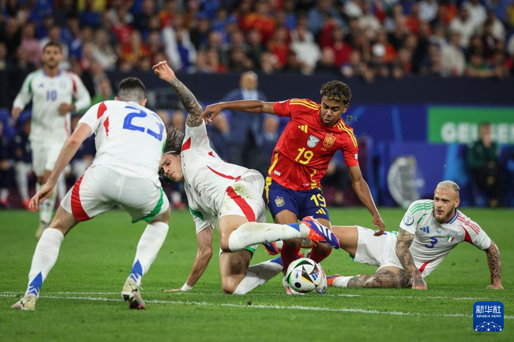 6月20日,西班牙队球员亚马尔(右三)在比赛中带球突破。新华社记者 潘昱龙 摄