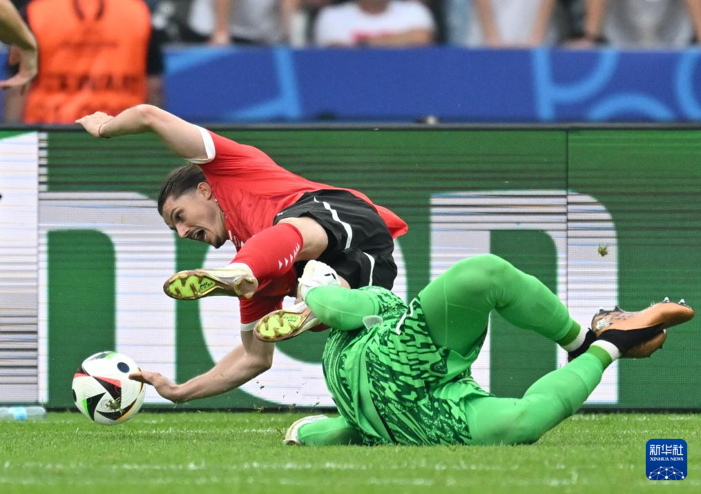 6月21日,奥地利队守门员帕特里克·彭茨(上)在比赛中扑救。新华社记者 肖艺九 摄