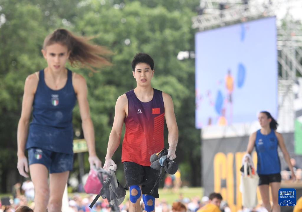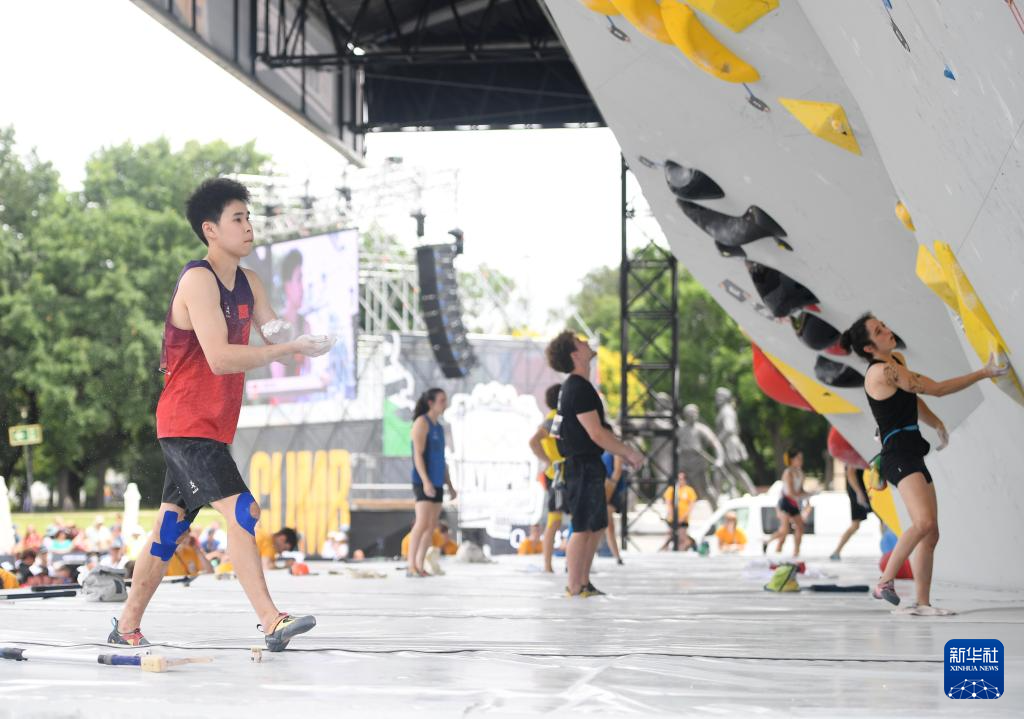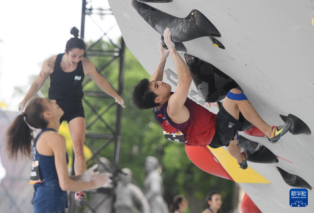 6月22日,中国选手潘愚非(中)在攀石赛中。新华社记者 贺灿铃 摄
