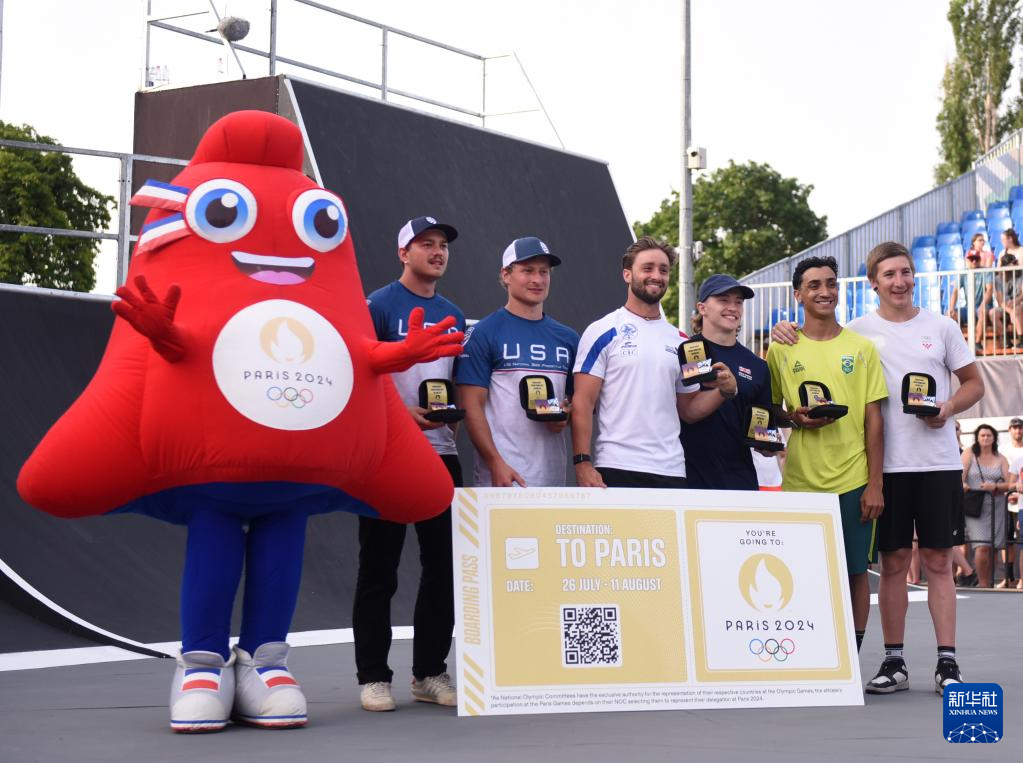 6月22日,通过资格系列赛获得自由式小轮车男子公园赛巴黎奥运会参赛资格的选手在颁奖仪式上合影。新华社记者 贺灿铃 摄