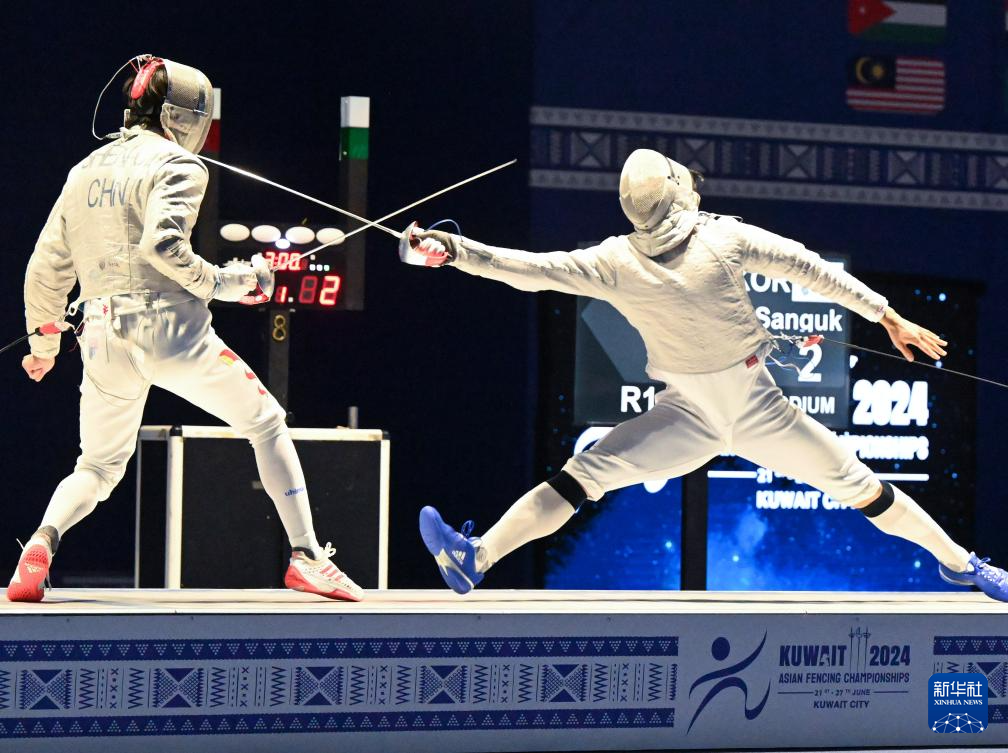 6月22日,中国选手沈晨鹏(左)与韩国选手吴尚旭在男子个人佩剑比赛中。新华社发(阿萨德摄)